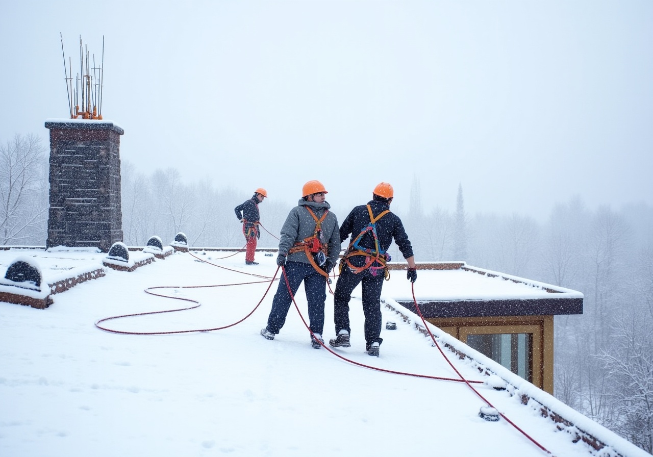 Работа на снежной кровле требует особой аккуратности, потому что снег и лёд снижают сцепление и увеличивают риск падений. Важен правильный доступ к месту ремонта — иногда приходится очищать крышу от снега и льда.